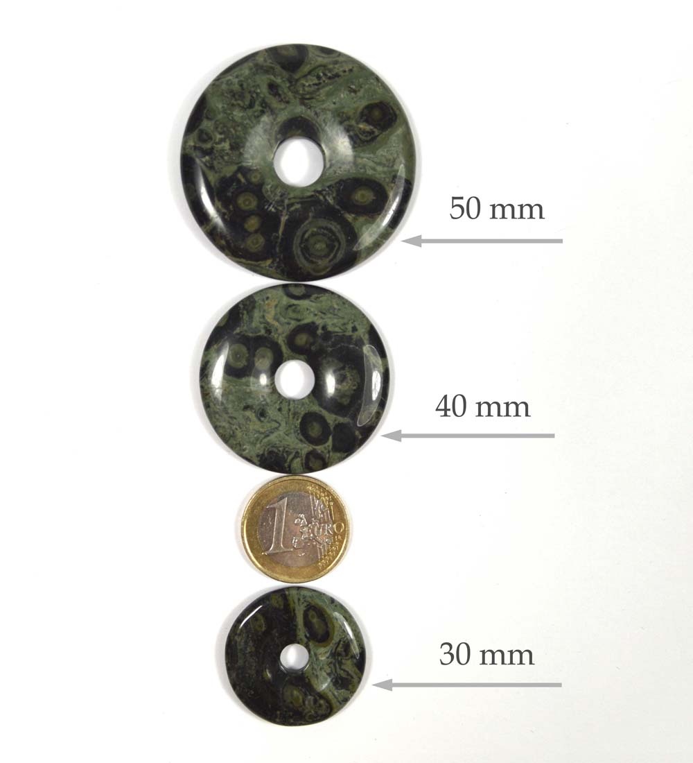 Üblicherweise wird der Donut an einem Lederband um den Hals getragen. Die beliebte Steinscheibe wird von Hand gelocht, geschliffen und sorgfältig poliert. Deshalb können die Formen leicht abweichen.